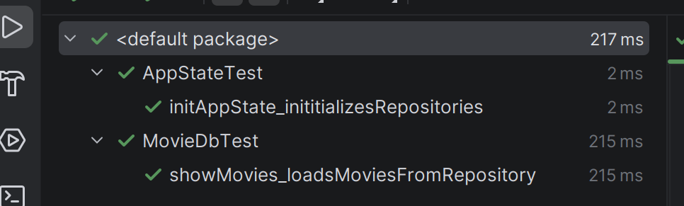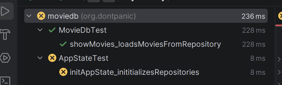 MovieDbTest configures the AppState to use mocks. The mocks are set up for the MovieDbTest cases only. However, when the AppStateTest starts, the AppState is ‘dirty’. Static fields (also known as class variables) are maintained for the lifetime of the class. This is usually the lifetime of the execution. JUnit runs all test cases in a single JVM. So changes to static fields in one test will persist to other tests in the same run.